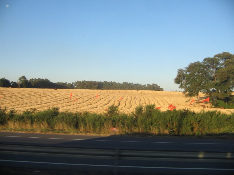(zurück zur Fotoübersicht) (Impressum, Rechtliches) (zum Teil über San Rafael) Eine chilenische Autobahn. Im chilenischen Kernland sind diese exzellent ausgebaut, mit Standstreifen und allem. Sogar das aus Deutschland vertraute Beschilderungschema wird verwendet. Allerdings, und das unterscheidet sie dann doch von den Deutschen, gibt es auch Bushaltestellen und Fußgänger auf der Strecke. Auf der Fahrt von Santiago nach Pucón lief nicht alles glatt. Die Toilette war kaputt, die Klimanlage funktionierte nicht (Hochsommer!) und wir hatten einen Reifenplatzer bei voller Fahrt, so dass wir statt nach 12 Stunden erst nach 15 ankamen. Immerhin kam niemand zu Schaden. Die Polizei wollte uns erst nicht weiterfahren lassen, weil Lenkzeiten und so weiter nicht eingehalten worden waren, aber die Mehrheit der Passagier wurde dann ärgerlich und so konnten wir doch noch weiterfahren. Kornfeld in der Abenddämmerung. Der See bei Pucón. Die Stadt ist aus zwei Gründen populär: einmal wegen eben dieses Badesees, zum anderen wegen des Vulkans, auf den man dort steigen kann. Zunächst mal aber ein Blick ins Innere von Pucón, welches sehr touristisch ist. Außer Läden, Restaurants, Hotels, Discos und Touristenagenturen gibt es nicht viel dort. Die Vulkanampel im Zentrum. Wir hatten "grünes Licht"... Kurzfassung: grün - Rauch, gelb - Qualm, rot - Weltuntergang. Und das ist er nun, der Vukan Villaricia. Nur ganz wenig Rauch steigt auf. Der Vulkan nochmal bei Sonnenuntergang. Beim Aufstieg. Das erste Stück sind wir noch mit dem Sessellift gefahren. Blick nach unten. Es ist immer noch früh morgens. Hinten sieht man den See. Ein paar Nebenberge. Hier haben wir pausiert. Insgesamt hat der Aufstieg etwa dreieinhalb Stunden gedauert, dies war nach der Hälfte. In Pucón bin ich das erste Mal länger über Eis gegangen, mit einem Eispickel. Beim Aufstieg. Dies ist der Gegenschuss zum vorletzten Foto. Der kleine Buckel hinten links ist der vom anderen Foto. Die kleinen Striche weiter unten sind andere Bergsteiger. Vulkangestein. Am Krater. Heute ist nur wenig Qualm da, so dass man sehr dicht heran konnte. Gipfelfoto. Es war ganz schön kalt da oben, so dass ich zwei Pullover und die Jacke anhatte... Unten liegt Pucón. Mehr Krater. Lecker Schwefelablagerungen! Gipfeljause. Runter ging es übrigens viel cooler: Man zog Schutzkleidung an, die man hochgeschleppt hatte, und rutschte dann auf dem eigenen Hintern zu Tale. Gebremst wurde mit dem Eispickel, was aber gar nicht so einfach ist - man bekommt ziemlich viel Fahrt drauf. Nach der Bergbesteigung habe ich Pucón Richtung Argentinien verlassen, dieser Bergsee lag nahe der Grenze. Hübsch, oder? Das Wasser leigt so still, dass sich sogar einzelne Bäume spiegeln. Der Grenzpass war wie üblich einfach eine Schotterstraße. Die Grenze geht mitten durch den Nationalpark Lanín, den man hier sieht. Der Gipfel gehört wie alles links davon zu Argentinien. Dieses Foto habe ich beim Warten auf die Abfertigung am Grenzposten gemacht. Ziemlich trocken da mitunter. Über diese Brücke konnte immer nur ein Auto gleicheitig. Wo in Deutschland eine portable Ampel stünde, haben die Argentinier halt mal jemanden den ganzen Tag in die Sonne gestellt. Die Region (um Junin de los Andes) ist ein Fischerparadies. Die Straßenschilder in junin haben alle die Form einer Forelle. La Anónima, die große Supermarktkette Patagoniens. Am See in San Martin de los Andes, wo die Reichen und Schönen Urlaub machen. Von hier aus führt die Sieben-Seen-Route nach Bariloche, welches ich als nächsten besuchen wollte. Am See. Eine Dampflok. Man beachte die starke Überstrahlung - die Sonne ist ziemlich stark dort unten im Süden. Ein paar der argentinischen Reisebusse am Terminal von San Martin. ... Die besten Ferienhäuser in San Martin, mit Seeblick. Nanu, sind wir in Dänemark? Oben steht: "Touristische Unterkünfte" - so ein liebevoll gemachtes Hinweisschild sieht man selten in Argentinien. Auf der Sieben-Seen-Route. Das hier ist noch der See bei San Martin. Unterwegs waren zeitweise auch mal keine Seen zu sehen. Noch ein See Hier war kurz Pause, weil der Fahrer die Räder wieder festschrauben musste. Die blaue Farbe rührt von im Wasser gelösten Sedimenten her. Leider wird die Strecke ausgebaut, was viel von ihrem Charme vernichten wird. Noch mehr See. Und noch mehr. Der große See, an dem Bariloche liegt. Im Hintergrund kann man es schon sehen. Hinten die Vorkordillere der Anden. Der Hauptplatz von Bariloche. General Roca auf dem Pferd wird gerade gesäubert. Neben der Lage inmitten von National-, Provinz- und sonstigen Parks ist Bariloche noch als Schokoladenhauptstadt Argentiniens und als traditionelles Ziel für Abschlussfahrten bekannt. Dunkel wars der Mond schien helle. Am Eingang zum Nationalpark Nahuel Huapi bei Bariloche. Blick in die Gegenrichtung, mal kein Wasser. Ein Fluss im Park. Wir sind eine ganze Weile an dem entlang gefahren und er wurde immer blauer. Forellenangeln ist sehr beliebt im Park, auch wenn die eigentlich nicht endemisch sind. Hier steht eine unter einer Brücke. Am selben Fluss, eigentlich nur wenige dutzend Meter weiter Ja, das Wasser ist wirklich so blau. Panoramabild: Anklicken zum Vergrößen. Zurück im Browser klicken, um hier zurück zu kommen. Der Baumbestand, der unter anderem durch den Park geschützt werden soll. An die Namen erinnere ich mich nicht mehr, Lenga dürfte aber dabei sein. Der Fluss von vorhin. Die weiße Färbung stammt von der Gletschermilch, aus der sich der Fluss speist. Die Straße, die wir gekommen waren, ist vormittags nur in Richtung in den Park, nachmittags nur in Rückrichtung geöffnet, weil sie so schmal ist. Der Tronador (Donnerer) im Hintergrund. Dieser Berg war das Ziel der Tour. Diesmal mit Blumen. Eine Endmoräne des Gletschers, zu dem wir wollten. Der Tronador im close-up. Was passiert hier? Die obere Schneeschicht ist die Abbruchkante eines Gletschers und über 100 Meter dick. Durch die Vorwärtsbewegung des G